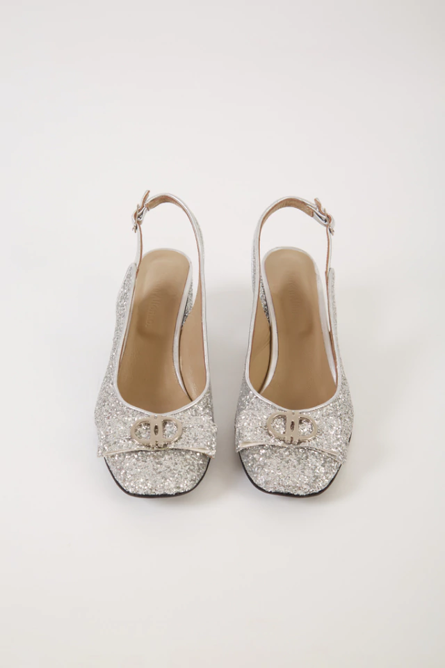 DESCRIPCION: Sandalias con taco de cuero glitter con herraje de metal bañado en plata. 100% cuero.