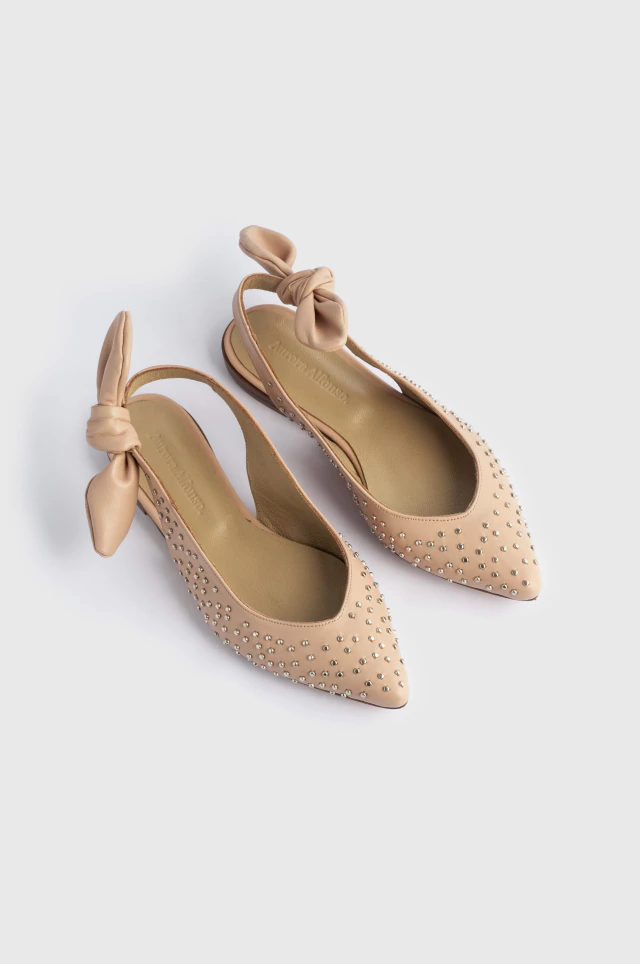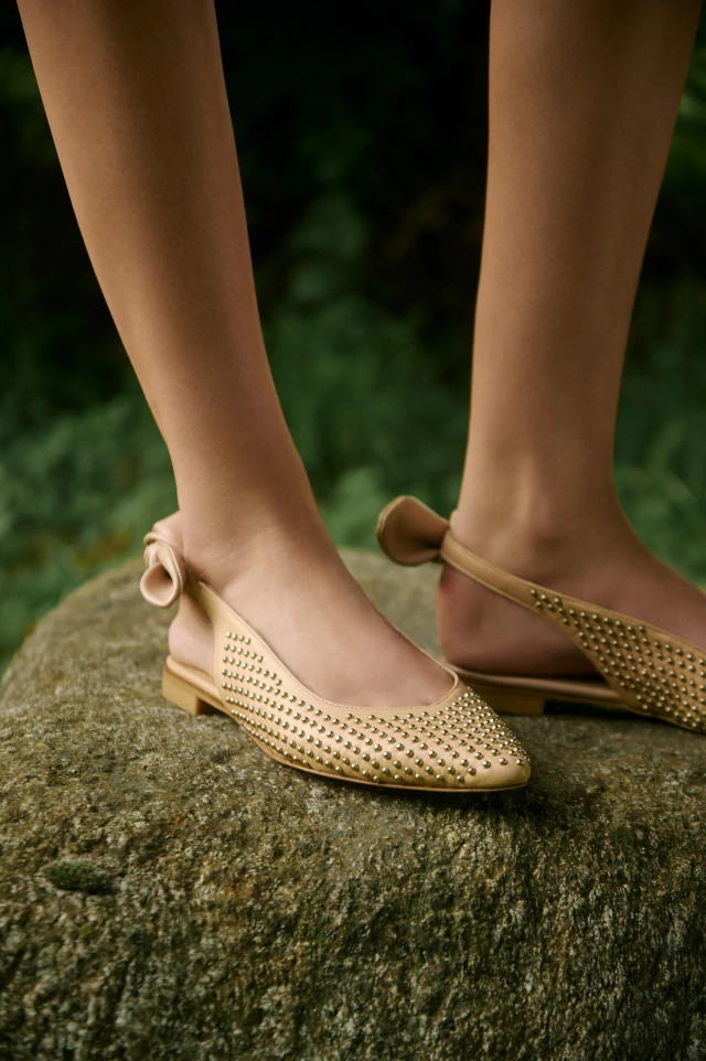 DESCRIPCIÓN: Ballerina confeccionada en 100% cuero, con suela de cuero que aporta flexibilidad y estilo. Su diseño se destaca por el moño lateral y el detalle de tachas metálicas, que le dan un aire moderno sin perder la delicadeza.