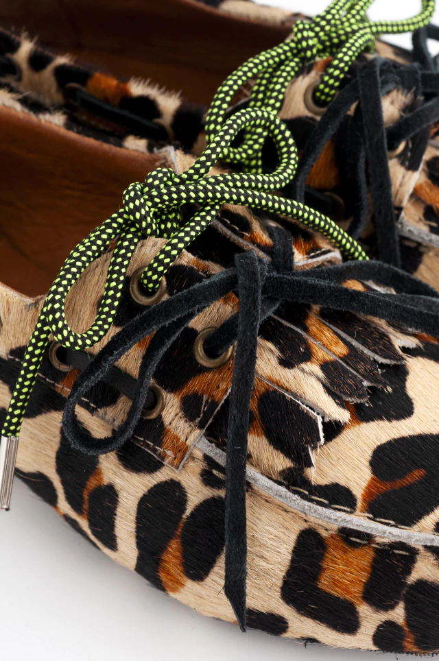 DESCRIPCIÓN: Mocasines tipo náutico confeccionados en cuero animal print de alta calidad. Este modelo incluye dos pares de cordones intercambiables: uno en gamuza negro y otro en soga amarilla/negro, para que personalices tu estilo a tu manera. La suela de goma brinda excelente agarre, y su plantilla ultra cómoda garantiza confort durante todo el día..