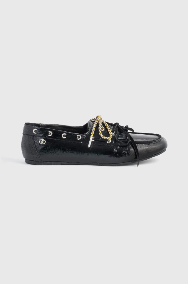 DESCRIPTION: Boat shoes in black leather. Includes two pairs of laces: black leather and rope. Rubber sole for greater grip and ultra-comfortable insole.